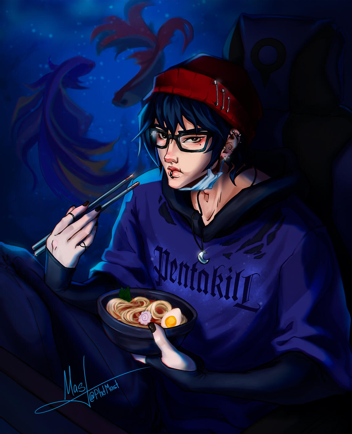 Accessories/clothes: Loose baggy hoodies. Pastels, lots of pastels. Joggers and shorts. Comfy sneakers. Fidget toys. Always has his phone (pastel pink case).