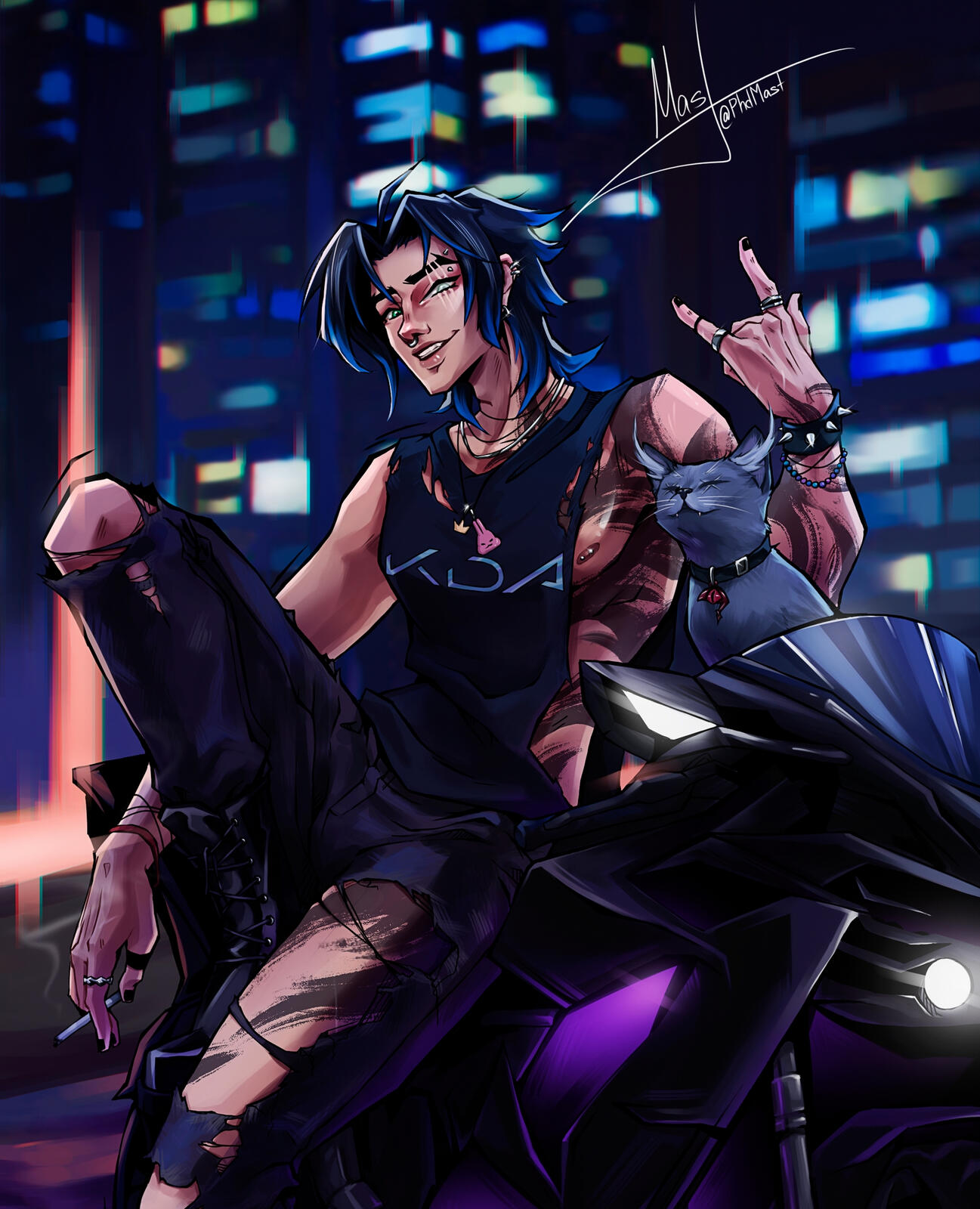 Occupation: Riot employee.Orphaned at birth in Noxus, Kayn spent the first few years of his life knowing only neglect and abuse. As a toddler, he was adopted by Zed and Shen, who took him home to Ionia where they gave him a new name and a better life. Raised now with unconditional love and support, he grew into a happy, hardworking man despite the lingering trauma that darkened him as he navigated his teenage years. During those years, he stumbled across Ezreal's stream out of a desire to get better at League and found inspiration in the boy even if he was childishly envious of his skill. Since Zed was in the music industry, Kayn grew up with an appreciation for singing and guitar, and while Zed always encouraged him in music, Kayn lacked the confidence and ultimately pursued a more stable career at Riot. One day, an incident with an abandoned kitten left him with damaged vision in his left eye and a bunch of nasty scars. However, refusing to ditch the kitten he saw so much of himself in, Kayn adopted him and named him Rhaast. Still, the scars left on his face cracked Kayn's confidence and he became more pessimistic as strangers judged him on his "scary" appearance, which wasn't helped by his dark attire, sharp scowl, tattoos, black bike, and bad smoking habit. Now part of Ezreal's close circle of friends, Kayn finds himself growing closer to the proplayer he'd admired for a decade, all while regaining his confidence a little more each day.